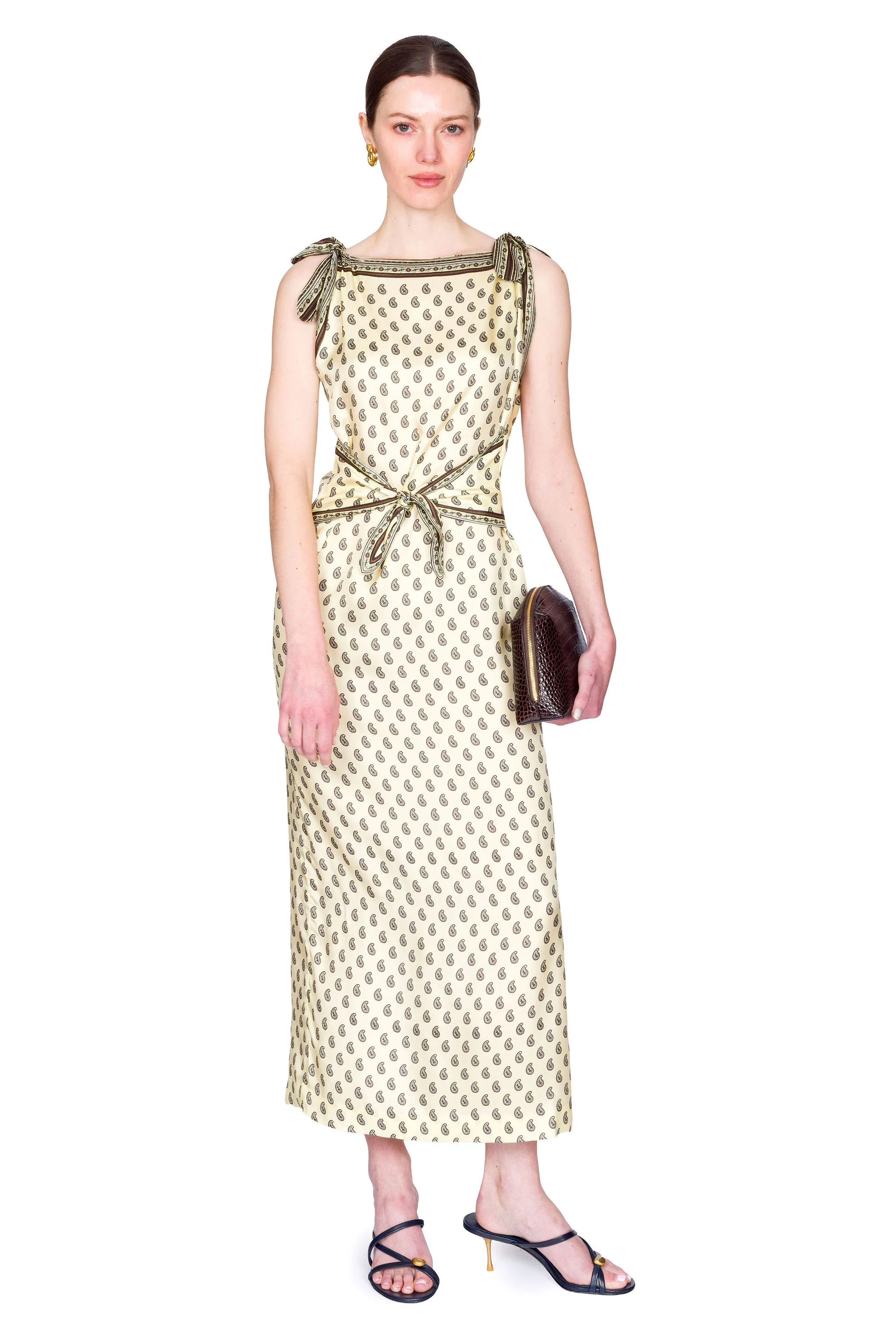Crafted from luxurious silk-viscose twill, the Amorette Dress features a refined sleeveless column silhouette with adjustable shoulder and waist ties for a customizable fit. The dress showcases our signature Taormina Paisley—an intricate pattern drawing inspiration from 19th-century French Provençal textiles. Finished with elegant placed borders framing the bateau neckline and arm openings, this piece seamlessly transitions from day to evening occasions.