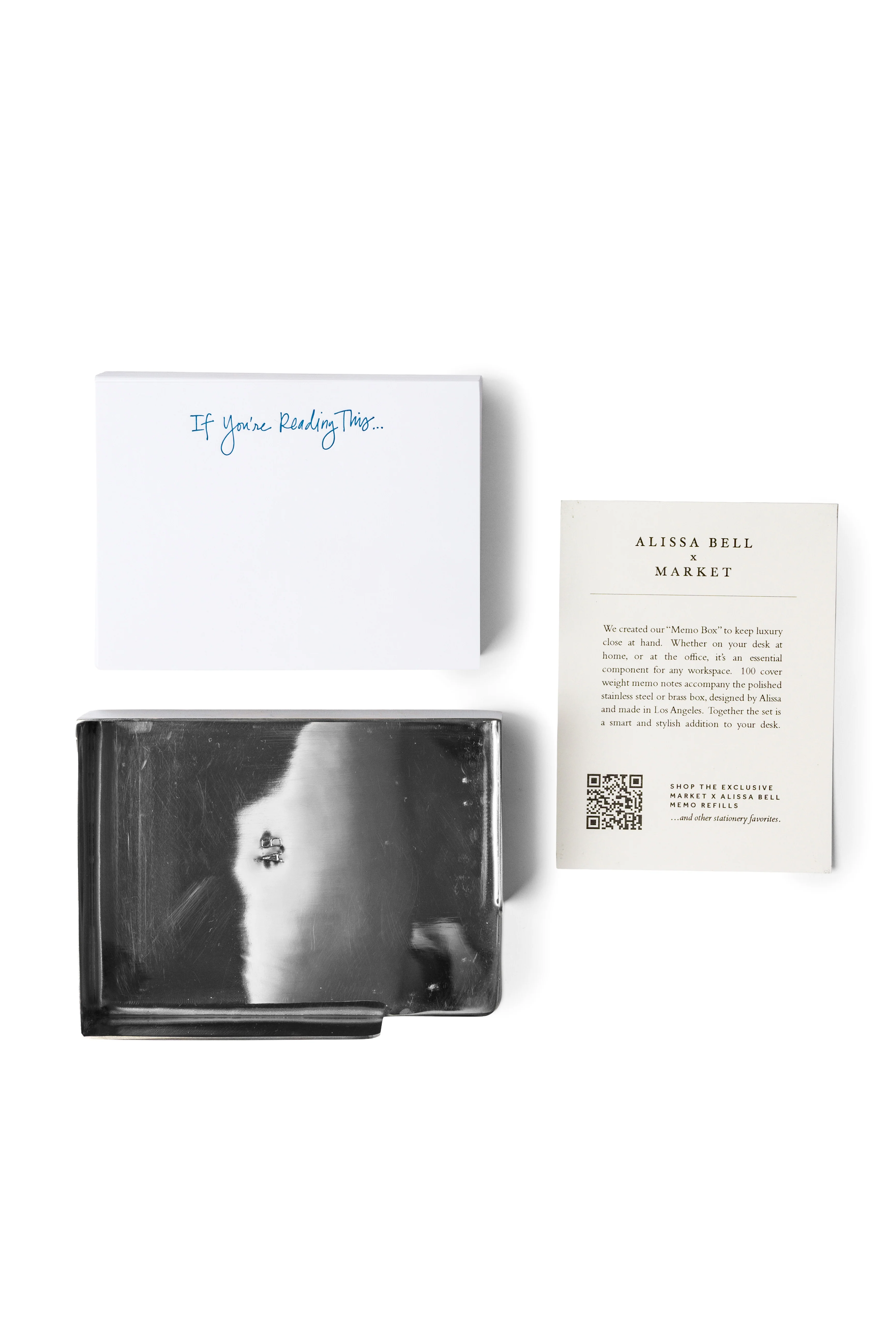 Say it in style with the Alissa Bell x MARKET "If You're Reading This" memo notes. Featuring a stainless steel memo box and 100 cover weight memo notes with "If You're Reading This..." debossed in blue.Â