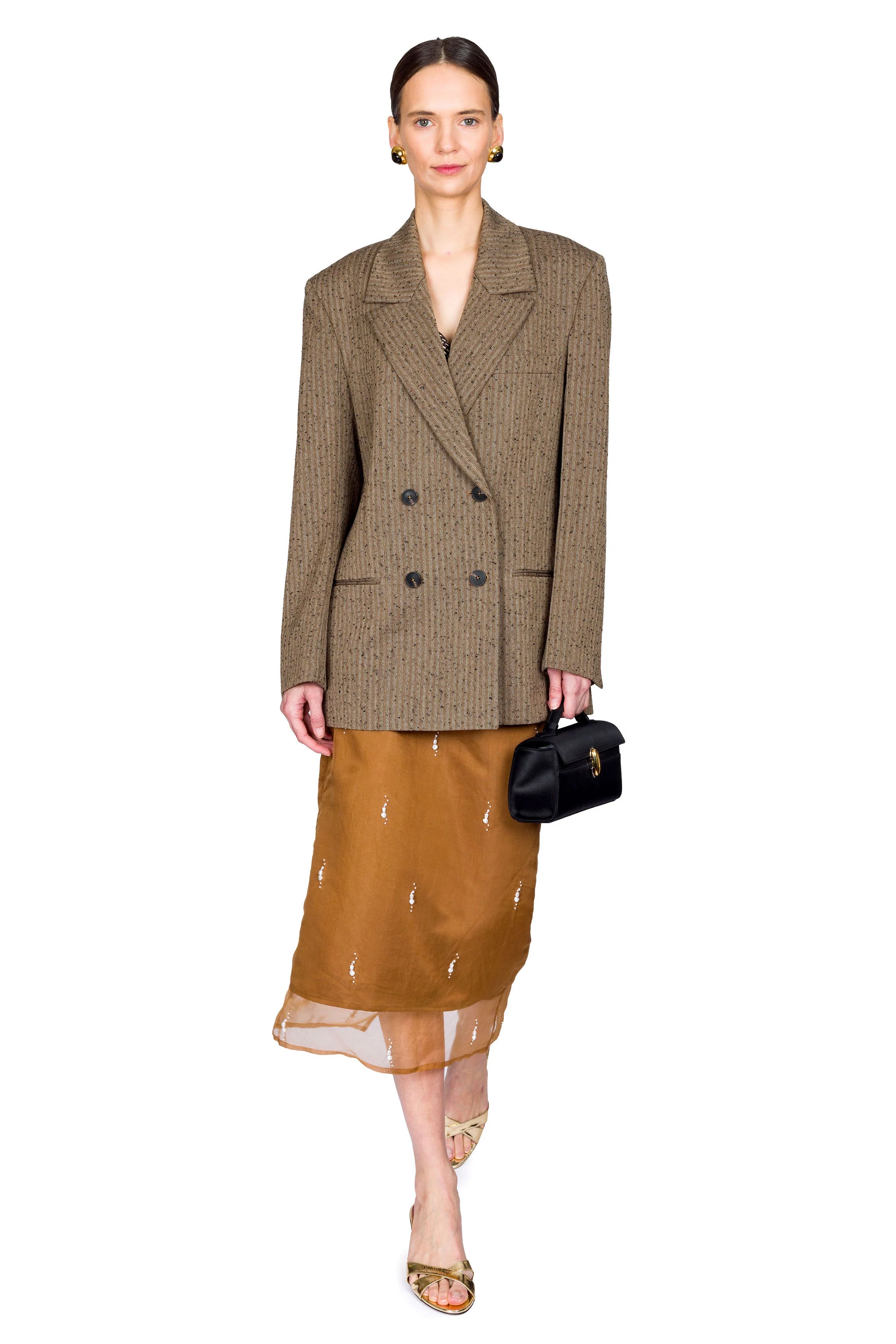 Elevate your wardrobe with this sophisticated pearl-embellished organza skirt in rich brown. Delicate pearls cascade across the sheer organza fabric, creating an ethereal yet refined silhouette perfect for evening events or elevated everyday styling. The mid-length cut offers versatility, pairing beautifully with fitted tops for a balanced look. Lightweight and graceful, this piece brings understated luxury to any occasion.