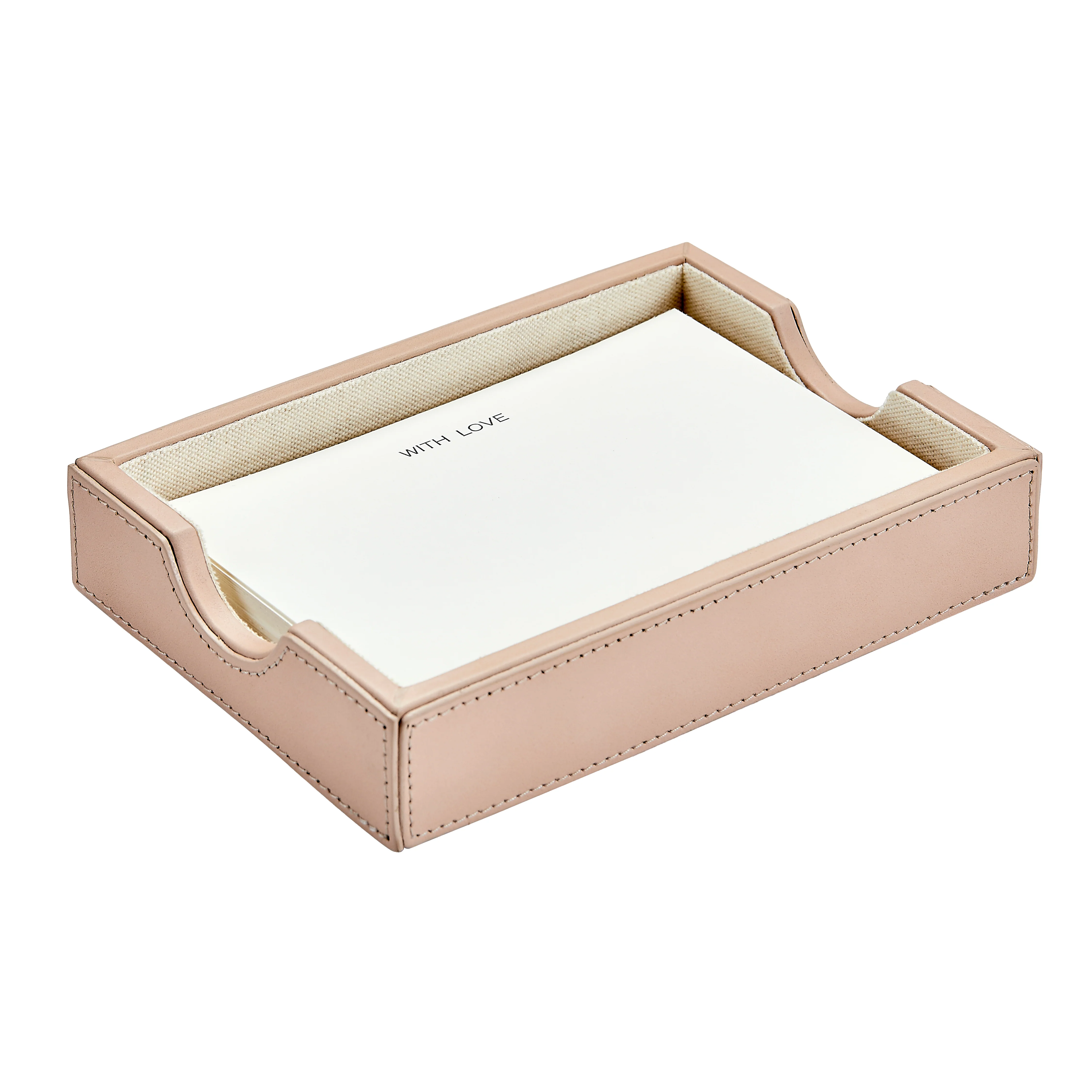 Elevate your stationary game with the "With Love" Nude Bonded Memo Tray. This sophisticated tray, crafted from premium nude bonded leather, comes with a set of 100 cards, perfect for jotting down notes and thoughts. Its sleek design fits 4x6 notecards, making it a functional and elegant addition to any desk or workspace.